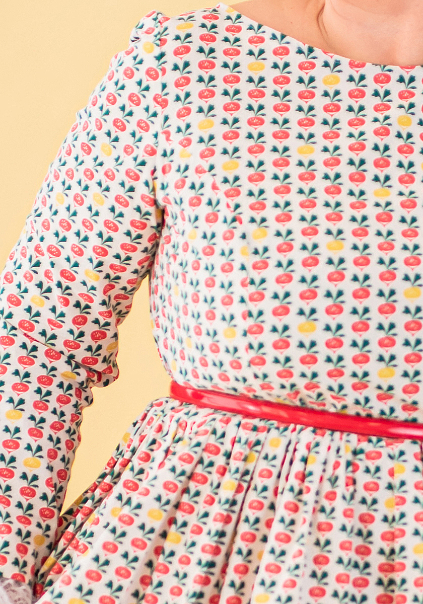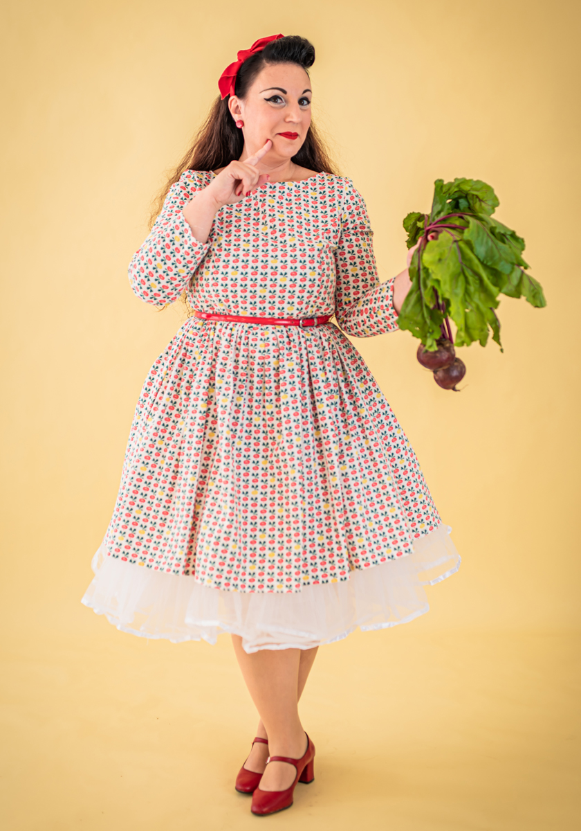 Our swing dress is a classic shape with vintage beetroots pattern.